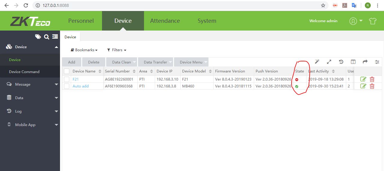 4. Setelah login lalu masuk menu device untuk cek apakah devicenya sudah terkoneksi. Jika sudah maka di kolom state akan dalam posisi ceklis warna hijau.