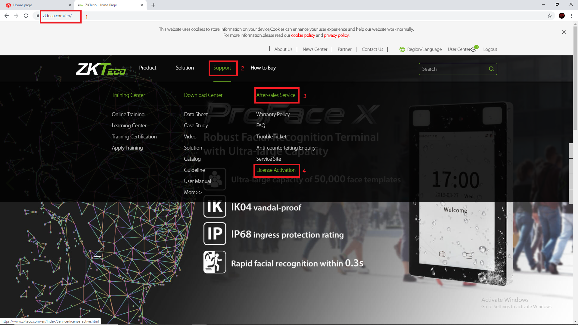 4. Setelah login, pilih "Support", "After sales service" dan "License Activation".