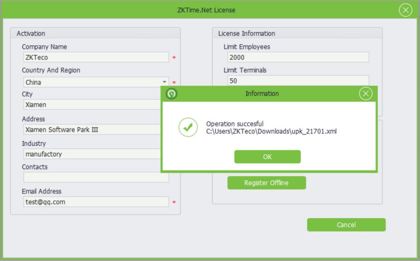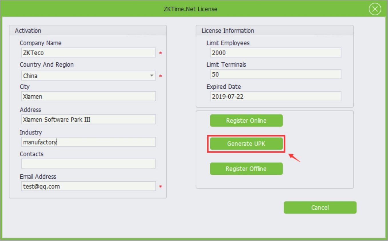 7.2 Isi informasi aktivasi di sebelah kiri, seperti Perusahaan, Negara dan Wilayah, Alamat Email dan seterusnya. Kemudian klik "Generate UPK", pilih file XX_SN.xml yang berasal dari sales.