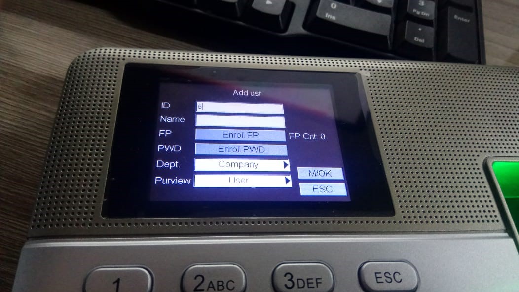 4.Masukkan ID, Nama, enroll FP (Maks 10 jari), enroll PWD, pilih dept, purview