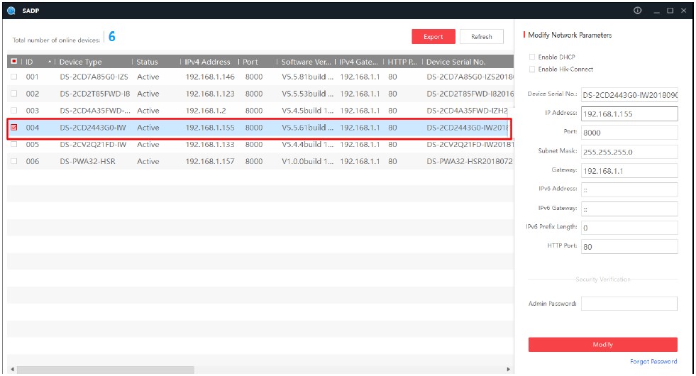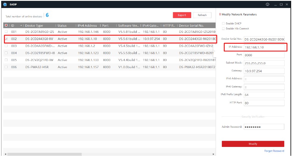 Hubungkan kamera dan PC ke router yang sama. Jalankan Software SADP dan semua kamera IP di LAN yang sama akan ditampilkan di Software. Tetapkan alamat IP untuk kamera (misalnya 192.168.1.10)