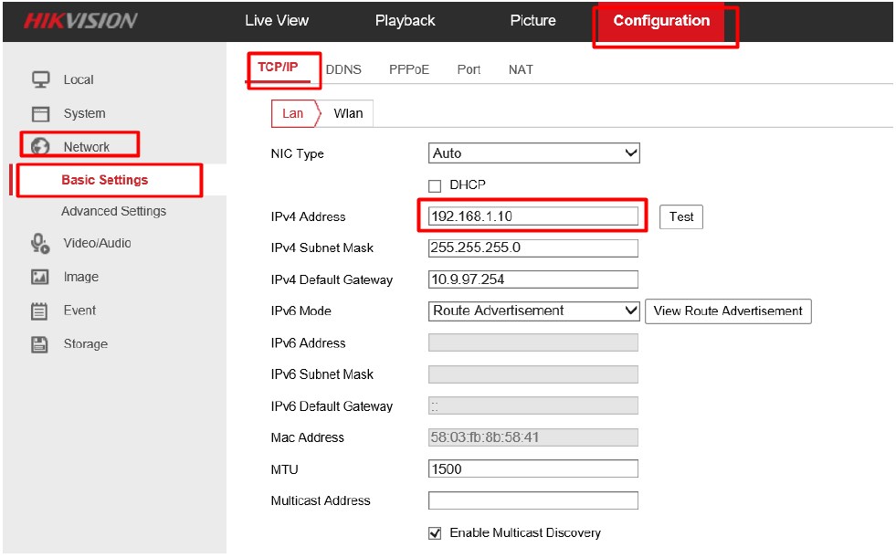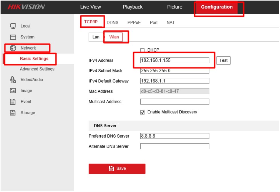 > Buka Configuration > Network > Advanced Setting > TCP/IP> WLAN. Dan kemudian kita dapat mengatur IP WLAN menjadi 192.168.1.155