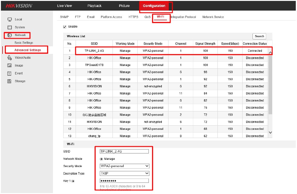 > Buka Configuration > Network > Advanced Setting > Wi-Fi, lalu klik Search. Kita dapat mencari semua router Wi-Fi terdekat. Silakan pilih router Wi-Fi lalu ketikkan parameter router Wi-Fi yang tepat. Dan kemudian klik Save