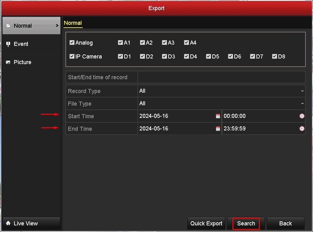 * Setelah masuk menu export, tentukan chanel kamera cctv yang akan kalian ambil hasil rekamanannya. Setelah itu tentukan durasi rekaman yang akan kalian ambil pada kolom Start Time dan End time. Start Time adalah waktu awal rekaman yang akan kalian ambil filenya dan end time adalah waktu akhir rekaman. Setelah itu klik Search dan tunggu proses membuka file rekaman sampai selesai.