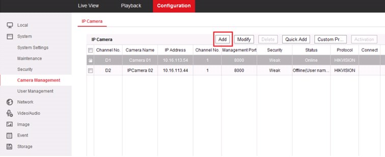 3.1. Buka Configuration – System - Camera Management – IP Camera, dan klik Add