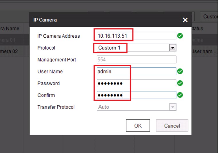 3.2. Ketik Alamat IP Camera, dan pilih Custom 1 Protokol yang telah dibuat sebelumnya. Kemudian isi User Name dan Password, klik OK