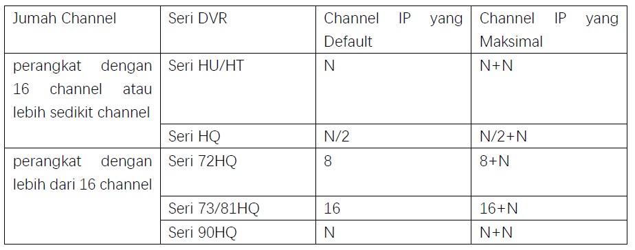DVR seri HQ yang jumlah channel analognya N ≤ 16 N = Jumlah analog channel Jumlah IP channel default(jika semua channel analog digunakan) Jumlah IP channel Max