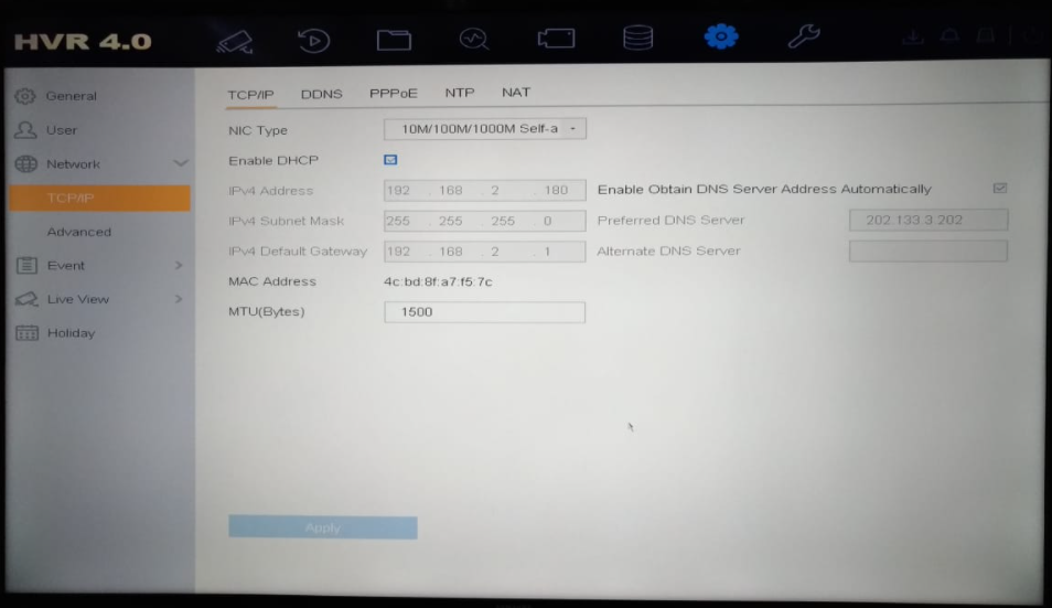 - Pada Menu, Network Recorder status ip dibuat DHCP