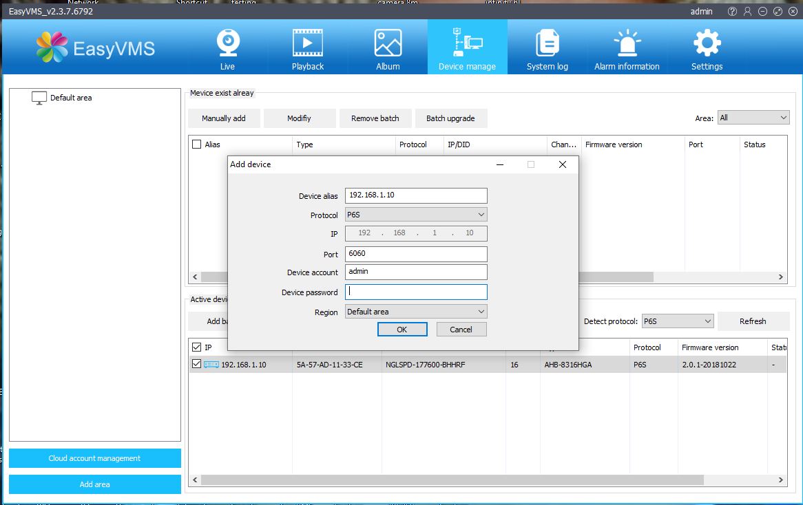 5. Add device lalu masukan password DVR